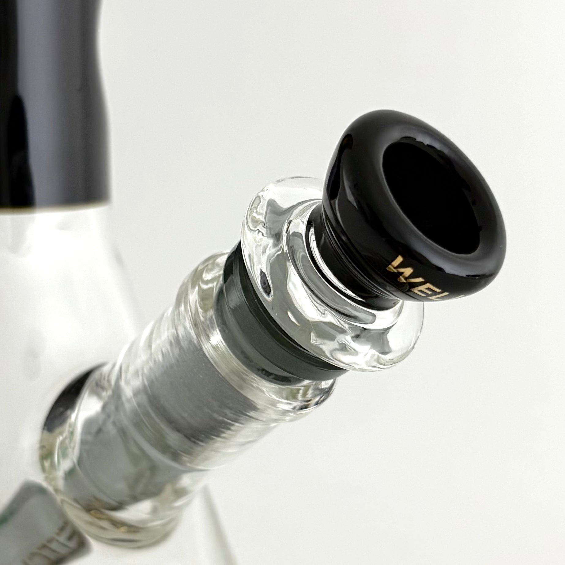 The design features a striking black straight neck finished with a clean white-rimmed mouthpiece, and highlighted by a vertical WELLCANN logo in bold gold lettering — a sleek and modern look that commands attention. The clear beaker base reveals a geometric gold pattern on the bottom and a discreet green WELL CANN leaf emblem, adding subtle artistic detail.